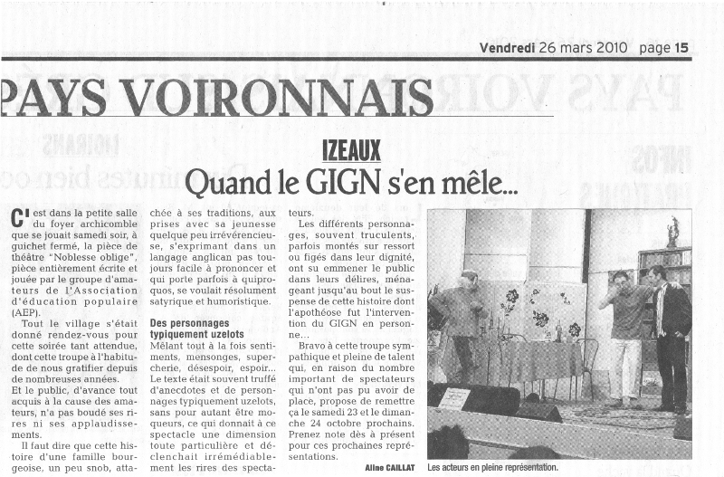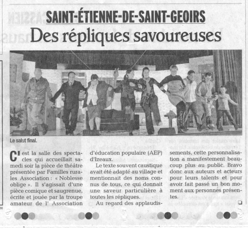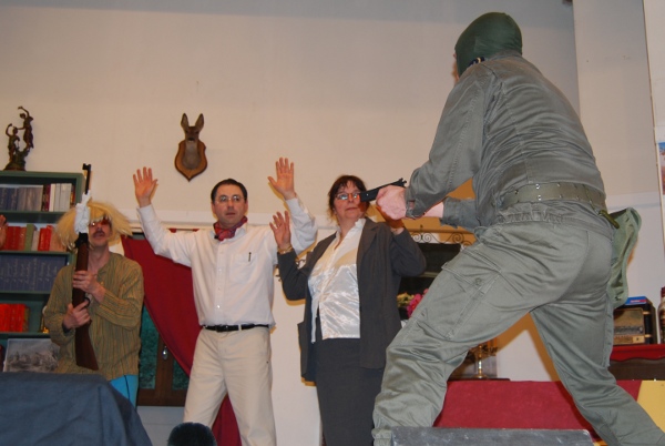 La troupe vous a fait partager sa création et découvrir la vie rangée d'une honorable famille uzelote (une des plus nobles d'Izeaux : le Baron et La Baronne du Moulin des Baronnaux), subissant quelques perturbations quand leur fille unique Marie-Victoire leur présente un futur gendre qui n'a rien d'idéal. Un serviteur paranoïaque et des gendarmes corrompus ne font que compliquer la situation.
